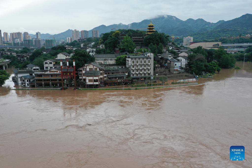 Aerial photo taken on Sept. 6, 2021 shows the flood-affected area in Ciqikou, southwest China's Chongqing Municipality. The emergency response for flood control was upgraded from level IV to III on Monday, according to Chongqing's flood control and drought relief headquarters, as Jialing River in Chongqing witnessed rapidly increasing water levels following constant heavy rainfall. (Xinhua/Wang Quanchao)