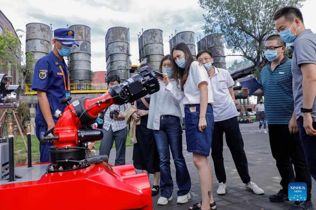 A firefighter introduces a firefighting robot to visitors at the Shougang Park during the 2021 China International Fair for Trade in Services (CIFTIS) in Beijing, capital of China, Sept. 6, 2021. (Xinhua/Zhang Yuwei)