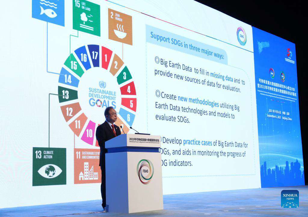 A guest delivers a speech during the inauguration ceremony of the International Research Center of Big Data for Sustainable Development Goals (SDGs) &opening ceremony of the International Forum on Big Data for Sustainable Development Goals in Beijing, capital of China, Sept. 6, 2021. The founding conference of the center and the opening ceremony of the forum were held in Beijing on Monday. (Xinhua/Jin Liwang)