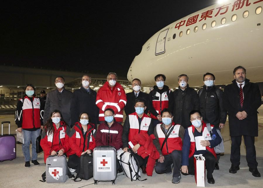 Chairman of Italian Red Cross Francesco Rocca (6th R, back) poses for photos with members of Chinese aid team at Fiumicino Airport in Rome, Italy, March 12, 2020. (Xinhua/Cheng Tingting)