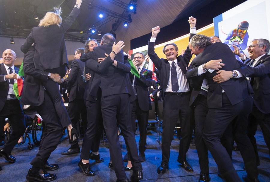 Members of the Milan-Cortina delegation celebrate after the cities won the bid to host the 2026 Winter Olympic Games during the 134th session of the International Olympic Committee (IOC) in Lausanne, Switzerland, on June 24, 2019. (Xinhua/Xu Jinquan)