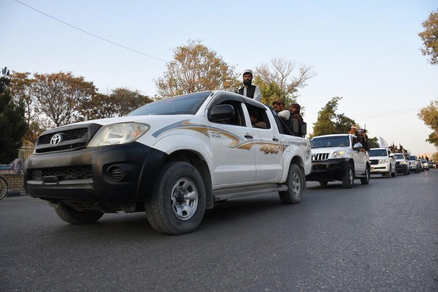 Military vehicles run in Mazar-i-Sharif, capital of northern Balkh province, Afghanistan, Aug. 31, 2021. (Photo by Kawa Basharat/Xinhua)