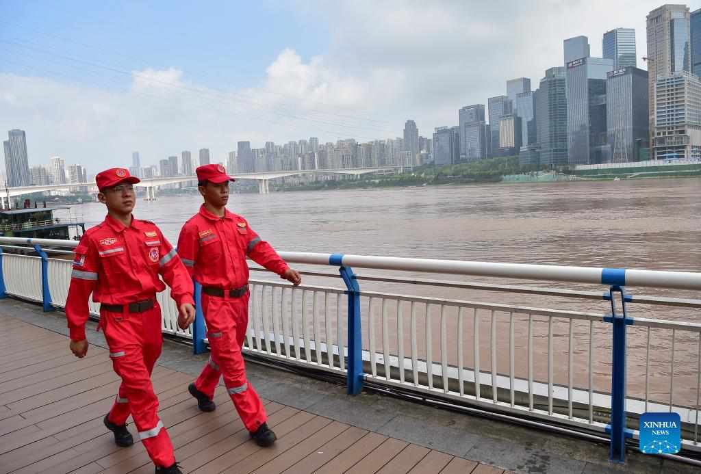 Emergency staff members patrol along the Yangtze River in southwest China's Chongqing Municipality, Sept. 7, 2021. The emergency response for flood control was upgraded from level III to II on Tuesday, according to Chongqing's flood control and drought relief headquarters. (Xinhua/Wang Quanchao)