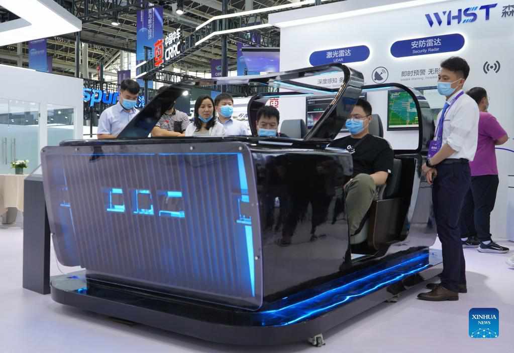 A man experiences a smart driving assistance system at the China International Digital Economy Expo 2021 in Shijiazhuang, north China's Hebei Province, Sept. 7, 2021. Themed "innovative development and digital economy," the China International Digital Economy Expo 2021 kicked off on Monday and will last until Sept. 8. The expo focuses on new business models, new patterns and hot topics in the digital economy, highlighting the coordinated development of the Beijing-Tianjin-Hebei region, the planning and construction of Xiong'an New Area and the preparation of the 2022 Winter Olympics. (Xinhua/Jin Haoyuan)
