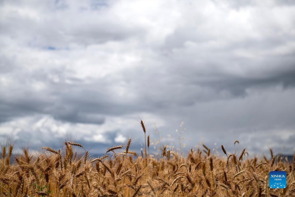 Photo taken on Sept. 6, 2021 shows the ripe highland barley in Lhunzhub County of Lhasa, capital of southwest China's Tibet Autonomous Region. (Xinhua/Sun Ruibo)