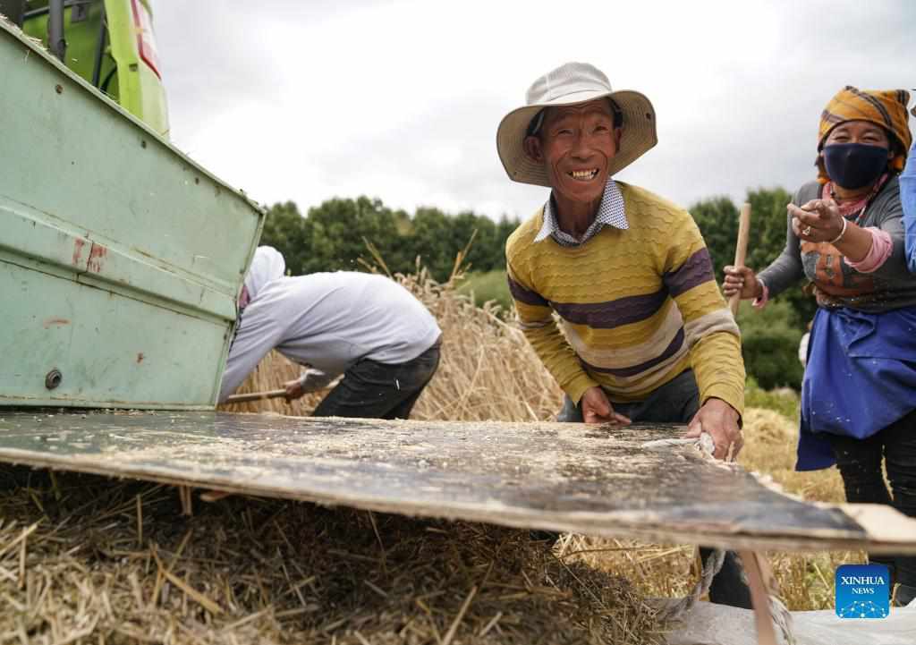 Farmers harvest highland barley at Kere Village of Dagze District, Lhasa, capital of southwest China's Tibet Autonomous Region, Sept. 6, 2021. (Xinhua/Jigme Dorje)