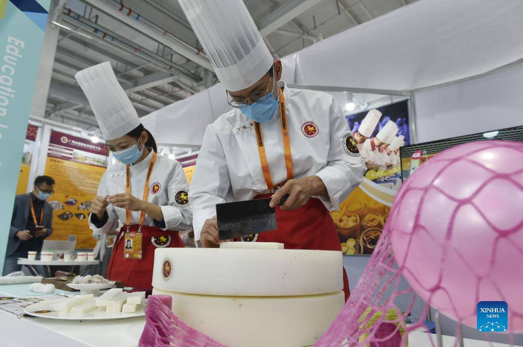 Exhibitors demonstrate their cooking skills at the China International Fair for Trade in Services (CIFTIS) in Beijing, capital of China, Sept. 6, 2021. (Xinhua/Lu Peng)
