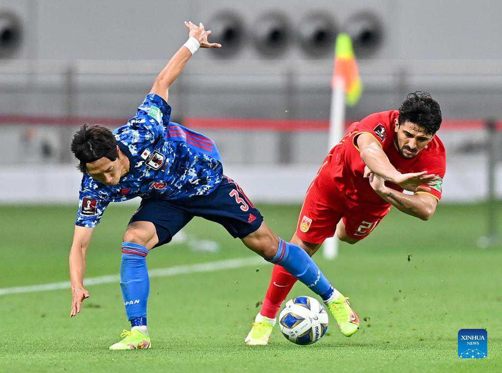 Luo Guofu (R) of China vies with Muroya Sei of Japan during the FIFA World Cup Qatar 2022 Asian qualification football match between China and Japan in Doha, Qatar, Sept. 7, 2021. (Photo by Nikku/Xinhua)