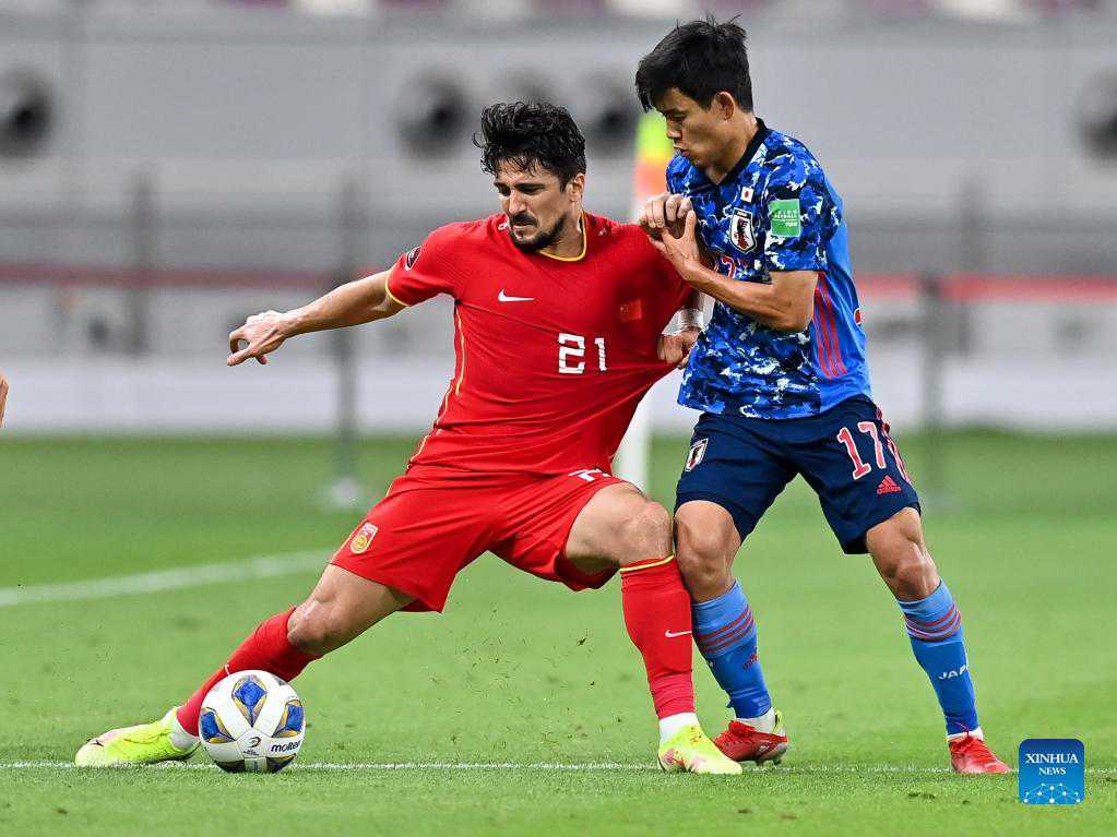 Luo Guofu (L) of China vies with Kubo Takefusa of Japan during the FIFA World Cup Qatar 2022 Asian qualification football match between China and Japan in Doha, Qatar, Sept. 7, 2021. (Photo by Nikku/Xinhua)