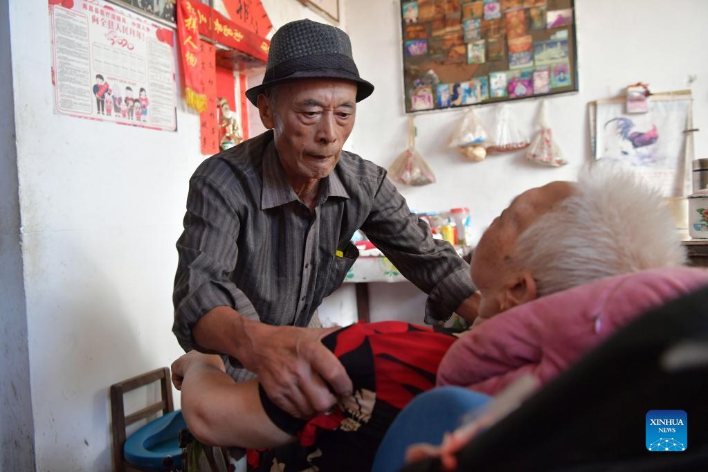 Luo Anmin prepares to take his wife outside to bathe some sunshine at Xuluo Village of Nanchang County, east China's Jiangxi Province, Sept. 5, 2021. Luo Anmin is 76 years old. In 2008, his wife Wan Zhaolian suffered from brain cancer and unfortunately lost consciousness, but Luo never gave up. He talked to his wife and gave her massages every day, hoping she can be better off some day. After three years of loving care, the miracle happened. In 2011, Wan Zhaolian regained consciousness, which gave Luo more hope although she still couldn't talk and walk. Luo said he loves his wife so much that he will be always by her side and taking good care of her as long as she is alive. To Luo, his wife means everything, and most importantly, a home. (Xinhua/Peng Zhaozhi)
