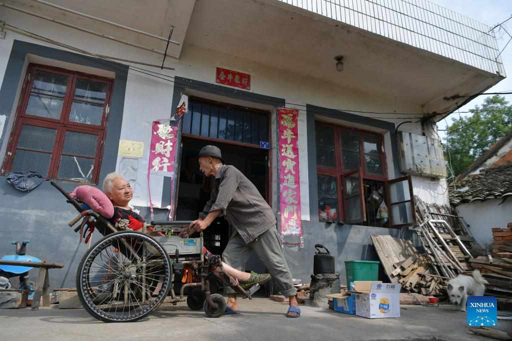 Luo Anmin takes his wife to the yard to bathe some sunshine at Xuluo Village of Nanchang County, east China's Jiangxi Province, Sept. 5, 2021. Luo Anmin is 76 years old. In 2008, his wife Wan Zhaolian suffered from brain cancer and unfortunately lost consciousness, but Luo never gave up. He talked to his wife and gave her massages every day, hoping she can be better off some day. After three years of loving care, the miracle happened. In 2011, Wan Zhaolian regained consciousness, which gave Luo more hope although she still couldn't talk and walk. Luo said he loves his wife so much that he will be always by her side and taking good care of her as long as she is alive. To Luo, his wife means everything, and most importantly, a home. (Xinhua/Peng Zhaozhi)
