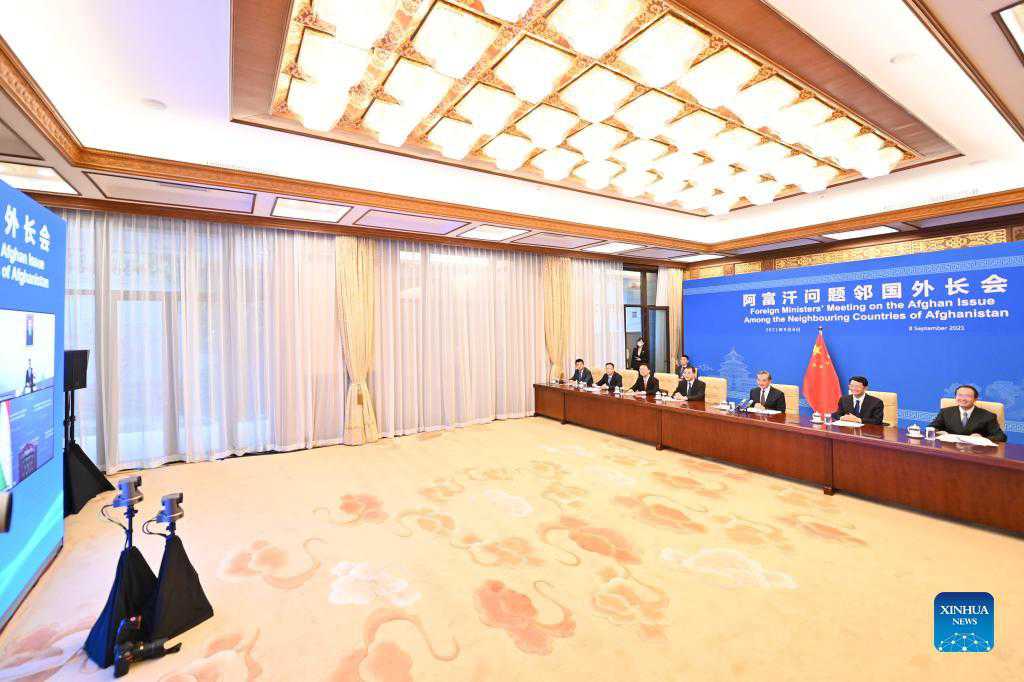BEIJING, Sept. 8 (Xinhua) -- Chinese State Councilor and Foreign Minister Wang Yi on Wednesday attended the first meeting of foreign ministers of Afghanistan's neighboring countries in Beijing via video link.