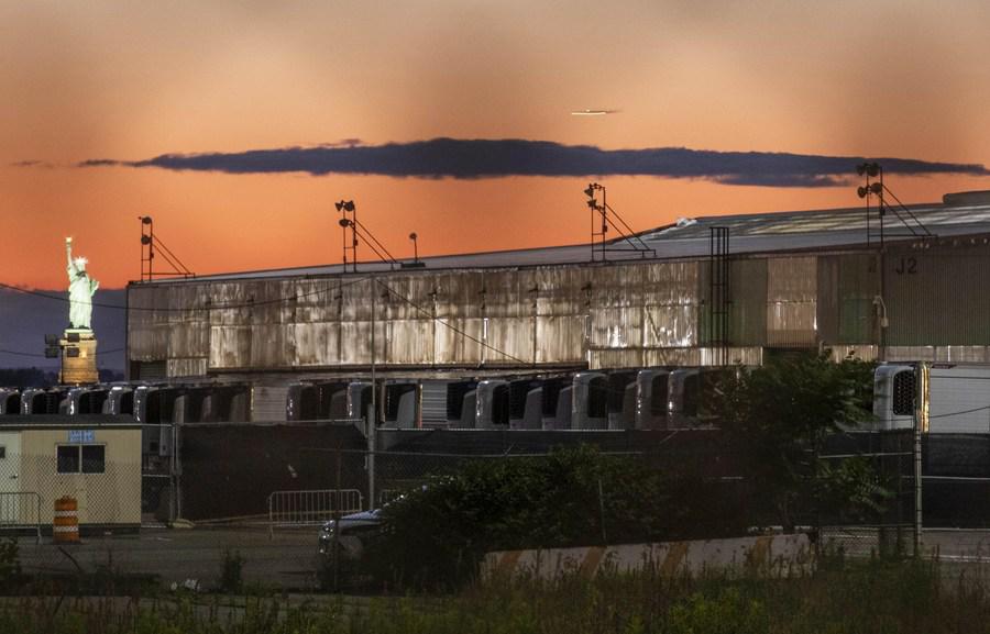Refrigerated trailers are seen at a temporary morgue in Brooklyn, New York, the United States, June 15, 2021. (Xinhua/Wang Ying)