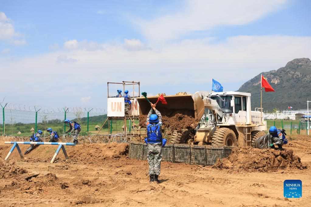 Peacekeepers participate in an international peacekeeping drill at a combined-arms tactical training base of the Chinese People's Liberation Army (PLA) in central China's Henan Province, Sept. 8, 2021. China started holding an international peacekeeping drill code-named "Shared Destiny-2021" on Sept. 6. Drills of battlefield reconnaissance, security guarding and patrol, armed escort, protection of civilians, response to violent and terrorist attacks, construction of temporary operation base, battlefield first aid, and pandemic control are expected to be conducted. (Xinhua/Liu Fang)