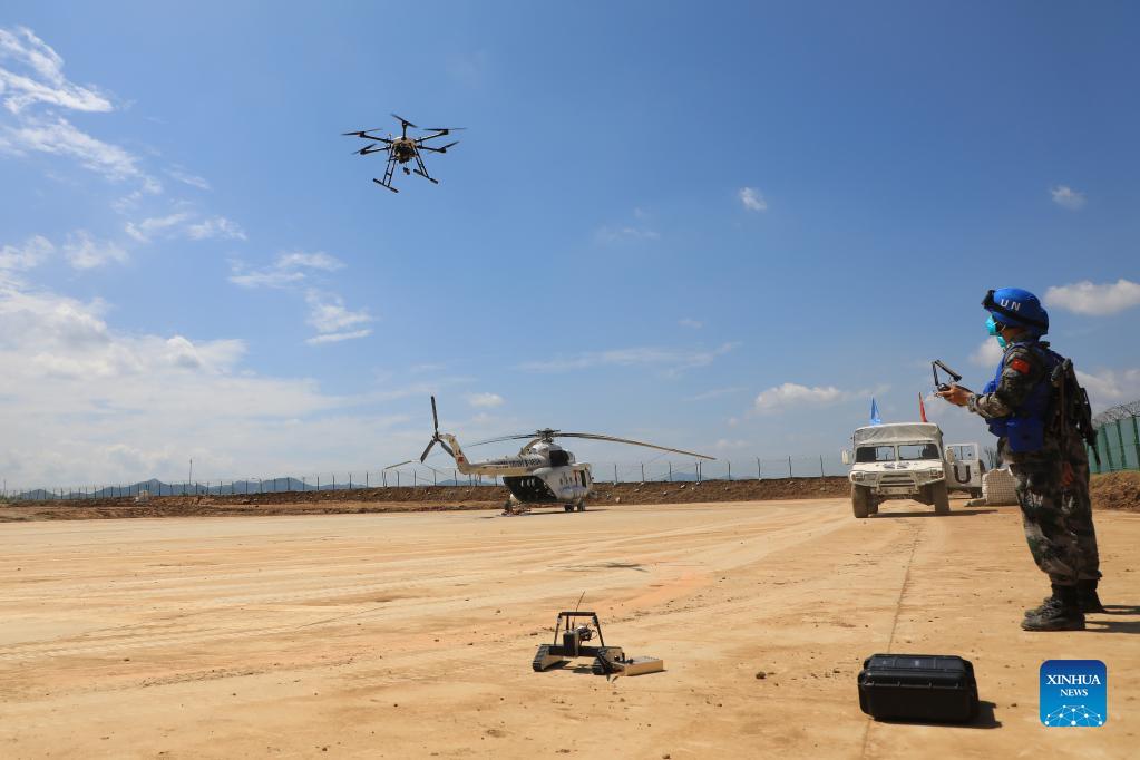 Photo taken on Sept. 8, 2021 shows a view of an international peacekeeping drill held at a combined-arms tactical training base of the Chinese People's Liberation Army (PLA) in central China's Henan. China started holding an international peacekeeping drill code-named "Shared Destiny-2021" on Sept. 6. Drills of battlefield reconnaissance, security guarding and patrol, armed escort, protection of civilians, response to violent and terrorist attacks, construction of temporary operation base, battlefield first aid, and pandemic control are expected to be conducted. (Xinhua/Liu Fang)