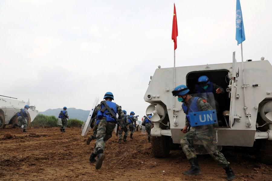 Peacekeepers participate in an international peacekeeping drill, code-named "Shared Destiny-2021", at a combined-arms tactical training base of the Chinese People's Liberation Army (PLA) in central China's Henan Province, Sept. 7, 2021. (Xinhua/Liu Fang)