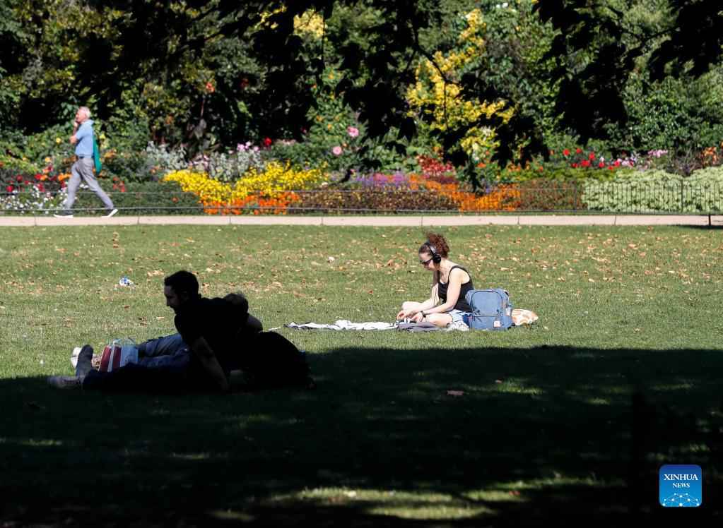 People enjoy the sunshine in St. James's Park in London, Britain, Sept. 8, 2021. (Xinhua/Han Yan)