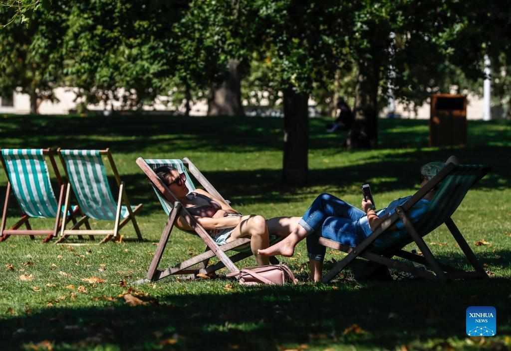 People enjoy the sunshine in St. James's Park in London, Britain, Sept. 8, 2021. (Xinhua/Han Yan)