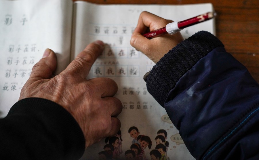 A rural teacher offers study guidance to his student at Jigao Primary School in Xiongcun Township, Lichuan County, east China's Jiangxi Province, Dec. 3, 2020. (Xinhua/Hu Chenhuan)