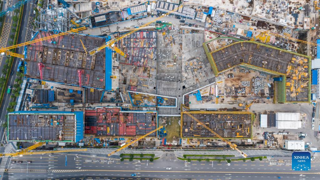 Aerial photo taken on Sept. 8, 2021 shows the construction site for a transaction center in Qianhai, Shenzhen City, south China's Guangdong Province. China's central authorities have issued a new plan for further developing a cooperation zone for the southern metropolis of Shenzhen and the Hong Kong Special Administrative Region (HKSAR). According to the plan, the reform and opening up of the Qianhai Shenzhen-Hong Kong Modern Service Industry Cooperation Zone will be comprehensively deepened. The plan, issued by the Communist Party of China Central Committee and the State Council, was made public on Monday. The general plan to establish the cooperation zone was approved by the State Council in 2010. (Xinhua/Mao Siqian)