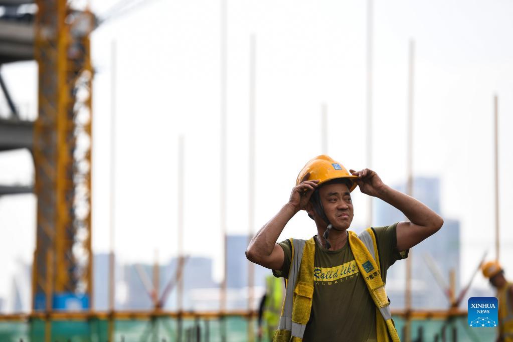 A worker is seen at the construction site for a transaction center in Qianhai, Shenzhen City, south China's Guangdong Province, on Sept. 8, 2021. China's central authorities have issued a new plan for further developing a cooperation zone for the southern metropolis of Shenzhen and the Hong Kong Special Administrative Region (HKSAR). According to the plan, the reform and opening up of the Qianhai Shenzhen-Hong Kong Modern Service Industry Cooperation Zone will be comprehensively deepened. The plan, issued by the Communist Party of China Central Committee and the State Council, was made public on Monday. The general plan to establish the cooperation zone was approved by the State Council in 2010. (Xinhua/Mao Siqian)