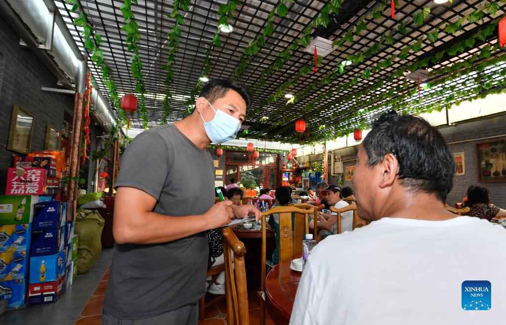Li Chao (L) serves a customer at his farmyard in Xiaoxinmatou Village of Baodi District in Tianjin, north China, Sept. 2, 2021. Li Chao is a post-90s born in Xiaoxinmatou Village in Baodi District. Located by the Chaobai River, the village used to witness an outflow of young people, as villagers made a living by traditional fishing and farming with low income. Like his young fellows, Li chose to be a migrant worker in the city for higher income. Waiter, chef, assembly line worker, security guard and salesman...the diligent man tried his hand at a variety of jobs over the past years, roving the city. In 2013, Li came back to his hometown to get married. A marvelous discovery for him, the small village has been transformed after renovation. Lucid waters, newly-built parks and neat farmyards...all the factors give the village characteristics and advantages to develop rural tourism industry. Witnessing the great changes, Li decided to stay and start an agritainment business in hometown. With the support of a host of favorable policies, the young man started a homestay business and soon expanded it due to excellent trading. "Better environment attracts a growing flow of tourists. During the peak season, rooms in my farmyard will be soon fully booked." Li said, who has been selected as a village commission member. "Now that I have been a member of the village commission, I'd like to do my best and help more fellow villagers to live a comfortable life." (Xinhua/Sun Fanyue)