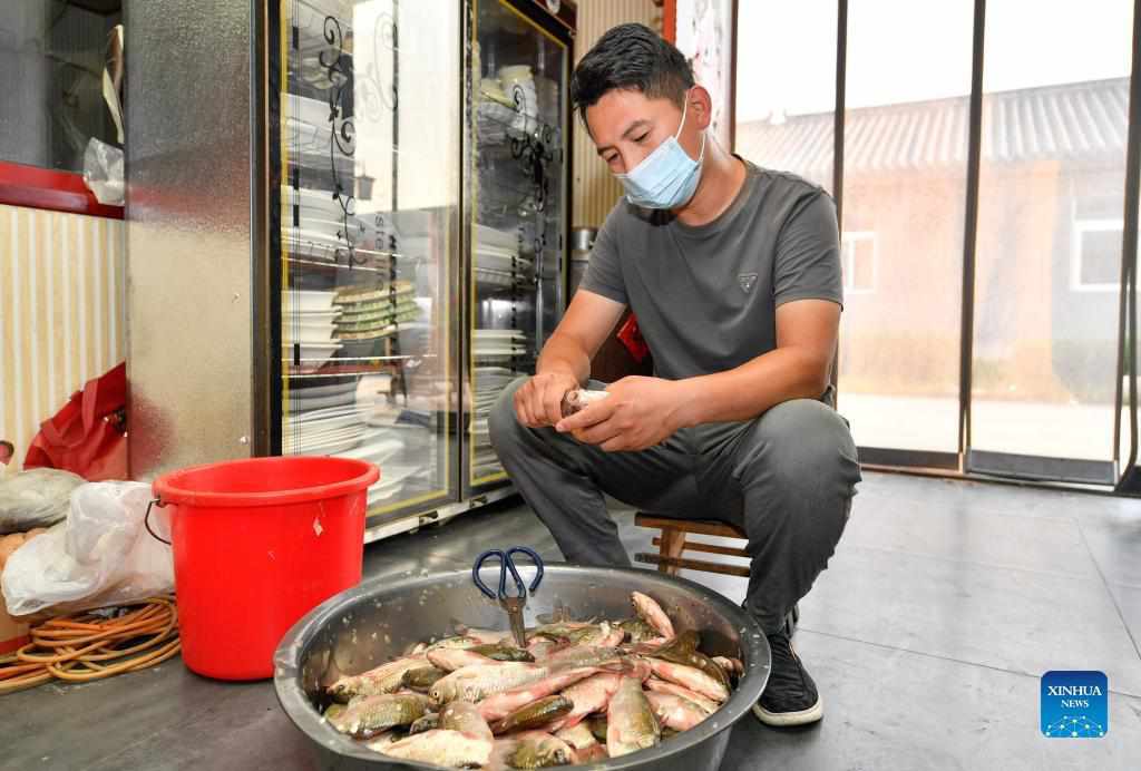 Li Chao processes fish in Xiaoxinmatou Village of Baodi District in Tianjin, north China, Sept. 3, 2021. Li Chao is a post-90s born in Xiaoxinmatou Village in Baodi District. Located by the Chaobai River, the village used to witness an outflow of young people, as villagers made a living by traditional fishing and farming with low income. Like his young fellows, Li chose to be a migrant worker in the city for higher income. Waiter, chef, assembly line worker, security guard and salesman...the diligent man tried his hand at a variety of jobs over the past years, roving the city. In 2013, Li came back to his hometown to get married. A marvelous discovery for him, the small village has been transformed after renovation. Lucid waters, newly-built parks and neat farmyards...all the factors give the village characteristics and advantages to develop rural tourism industry. Witnessing the great changes, Li decided to stay and start an agritainment business in hometown. With the support of a host of favorable policies, the young man started a homestay business and soon expanded it due to excellent trading. "Better environment attracts a growing flow of tourists. During the peak season, rooms in my farmyard will be soon fully booked." Li said, who has been selected as a village commission member. "Now that I have been a member of the village commission, I'd like to do my best and help more fellow villagers to live a comfortable life." (Xinhua/Sun Fanyue)