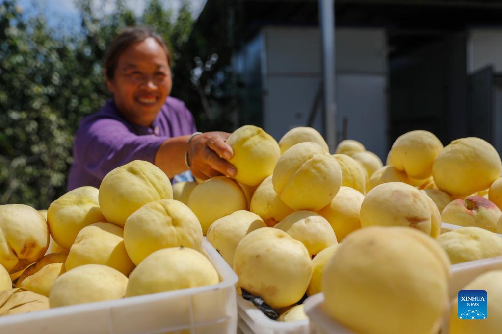 A farmer sorts out fresh peaches in Jinli Village of Baofeng County, central China's Henan Province, Sept. 8, 2021. (Photo by He Wuchang/Xinhua)