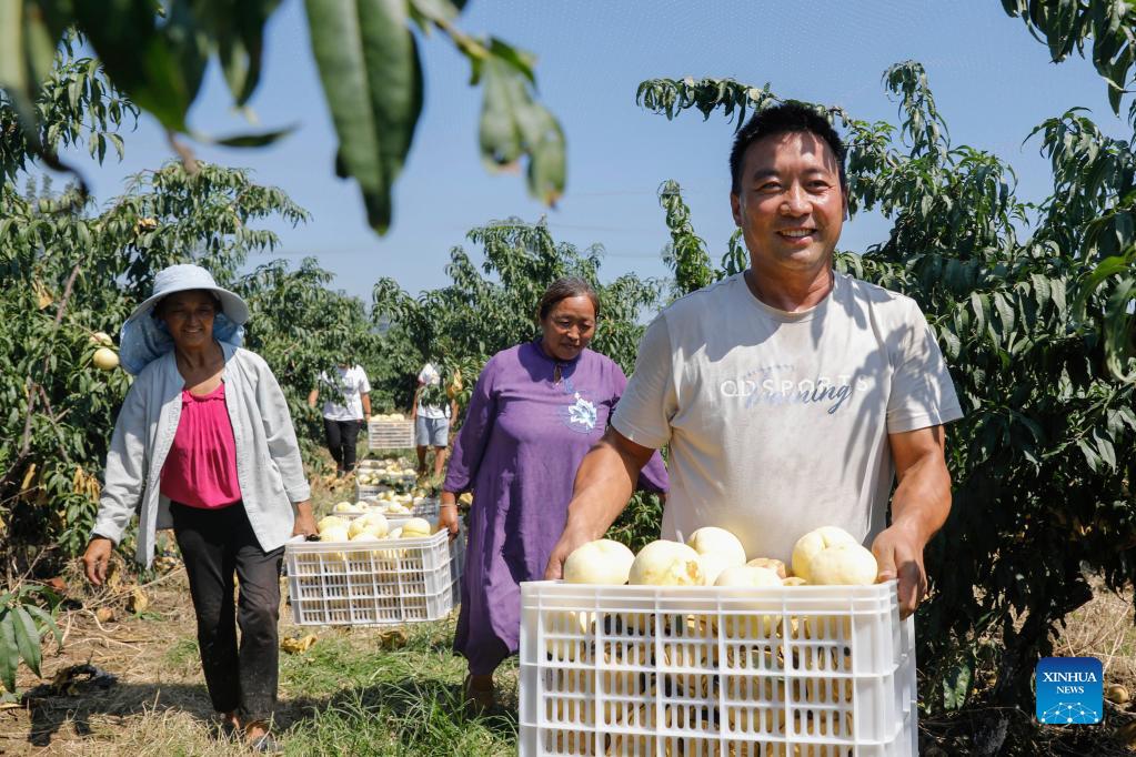 Farmers carry boxes of fresh peaches in Jinli Village of Baofeng County, central China's Henan Province, Sept. 8, 2021. (Photo by He Wuchang/Xinhua)