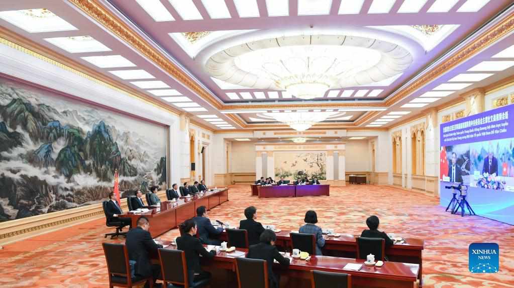Wang Yang, a member of the Standing Committee of the Political Bureau of the Communist Party of China (CPC) Central Committee and chairman of the Chinese People's Political Consultative Conference (CPPCC) National Committee, meets with President of the Vietnam Fatherland Front (VFF) Central Committee Do Van Chien via video link in Beijing, capital of China, Sept. 8, 2021. (Xinhua/Zhang Ling)