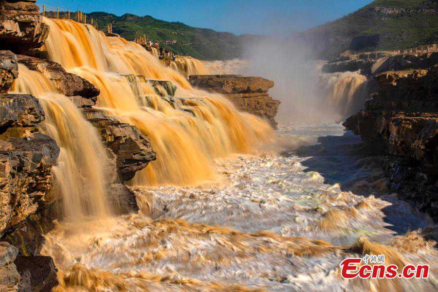 A giant, roaring torrent carrying a large amount of yellow sediment has created a spectacular early autumn scene at Hukou Waterfall, Yellow River in Qinjin Valley. (Photo: China News Service/Lan Hua)