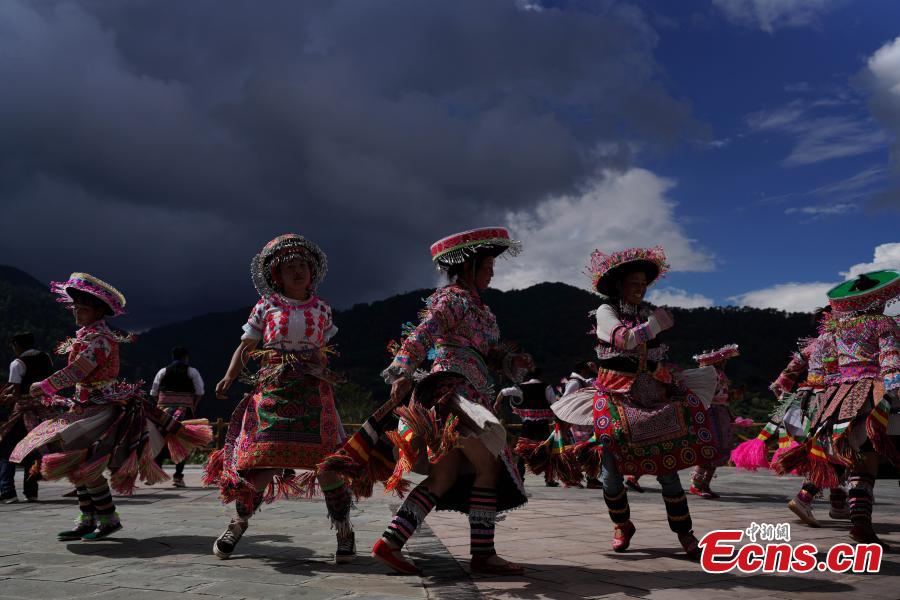 Miao women dance "Gameng Kadou" at a square in Yongping, Southwest China's Yunnan Province, Sept. 7, 2021. "Gameng Kadou," the dance with a history of more than 1,800 years, is a transliteration of the Miao language. The music accompanied by Lusheng, a reed-pipe wind instrument, comes from the original music elements of the Miao people. (Photo: China News Service/Kang Ping)