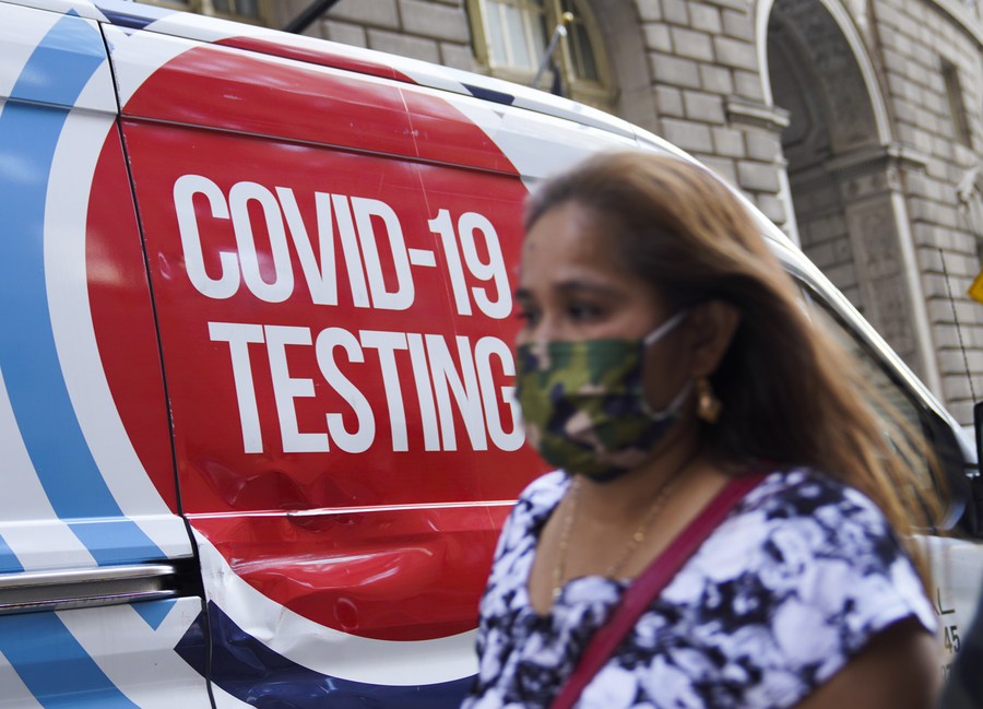 A pedestrian walks past a COVID-19 mobile testing site in New York, the United States, Sept. 6, 2021. (Xinhua/Wang Ying)