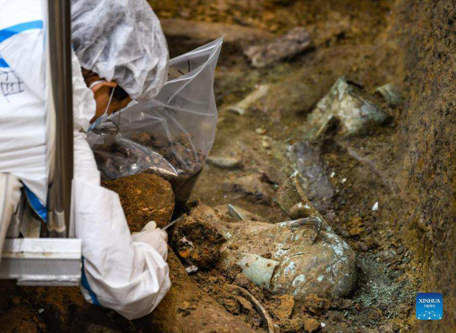 An archaeologist works at the No. 8 sacrificial pit of the Sanxingdui Ruins site in southwest China's Sichuan Province, Sept. 2, 2021. More than 500 pieces of relics have been discovered in recent months at the legendary Sanxingdui Ruins site, dazzling archaeologists with their historical value as well as the display of creativity and ingenuity. (Xinhua/Wang Xi)