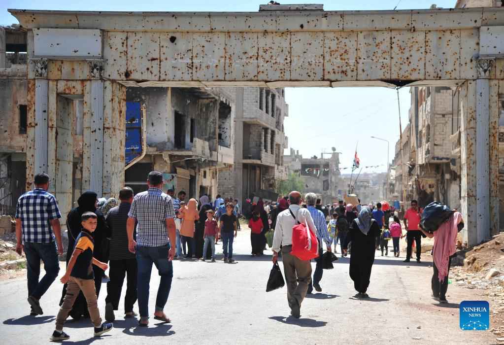 People return to their homes in Syria's southern province of Daraa, on Sept. 9, 2021. Thousands of people started returning to their homes in Daraa on Thursday following the army's entry to the formerly rebel-held areas, state news agency SANA reported. (Photo by Ammar Safarjalani/Xinhua)