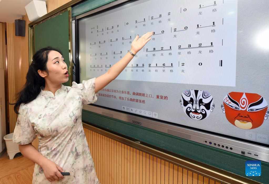 Wang Ling gives a music lesson at Heping Primary School in Hefei City, east China's Anhui Province, Sept. 8, 2021. Wang Ling, a music teacher from Heping Primary School, is passionate about Chinese traditional culture. Now she is in charge of teaching students to practice dragon and lion dance at an after-school club, hoping to enhance their team cohesiveness through this traditional activity. (Xinhua/Zhou Mu)