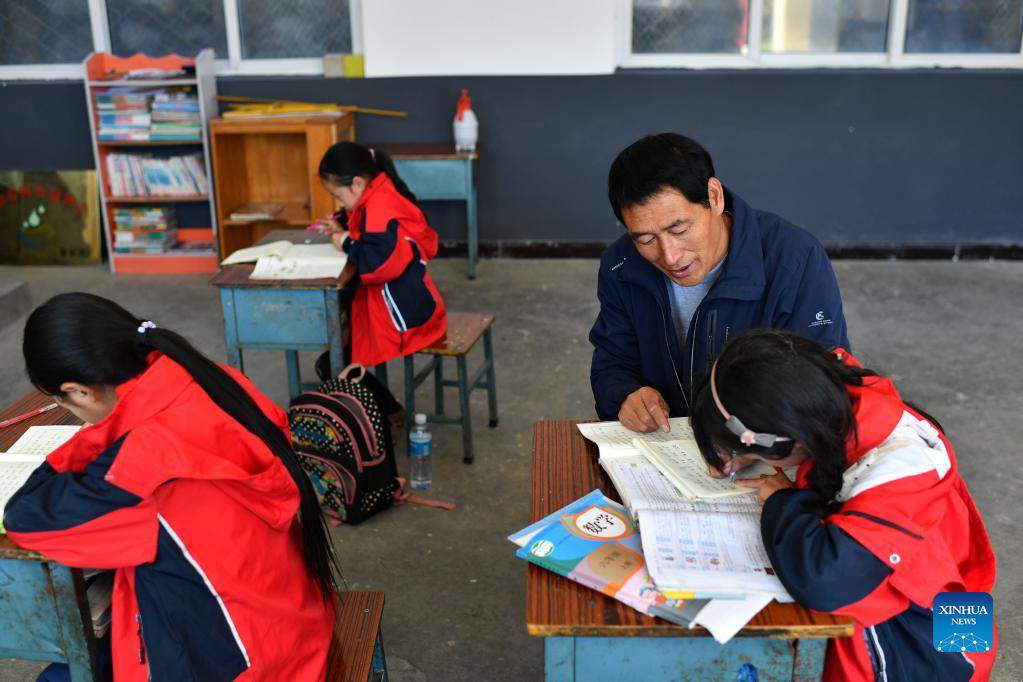 Song Zhongsheng tutors students with their homework at Datuo teaching site in Datuo Village, Pingshun County, Changzhi City of north China's Shanxi Province, Sept. 7, 2021. Nestled deeply in the Taihang Mountain at an elevation of 1,600 meters in Pingshun County, the Datuo teaching site is the only educational facility within 10 kilometers reach. Song Zhongsheng and his wife Li Yuemei, the only faculty at the site, have been working there for 16 years in a row, currently rendering their services to merely five students of varying ages. A perfect team of two, Song is responsible for classes of Chinese, political science, and physical education, as Li takes on mathematics, painting, and music. More often than not, they need to walk some of their students' home after a full day's work at site. "Education is a life changer. We are willing to devote our time here, serving as a bridge for these kids to walk out of the mountain." (Xinhua/Zhan Yan)
