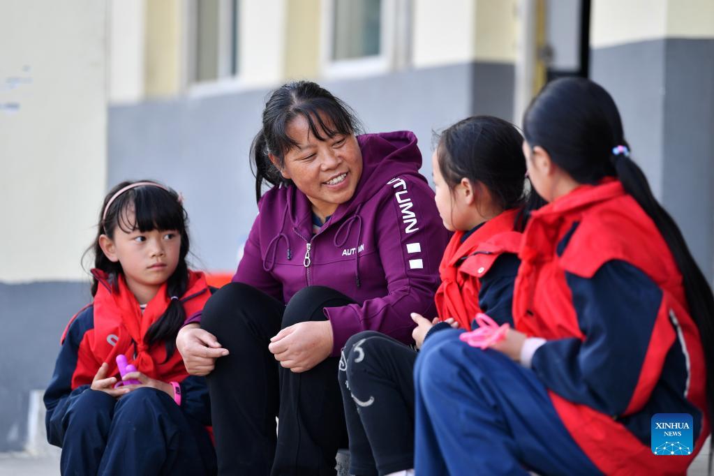 Li Yuemei chats with her students at Datuo teaching site in Datuo Village, Pingshun County, Changzhi City of north China's Shanxi Province, Sept. 7, 2021. Nestled deeply in the Taihang Mountain at an elevation of 1,600 meters in Pingshun County, the Datuo teaching site is the only educational facility within 10 kilometers reach. Song Zhongsheng and his wife Li Yuemei, the only faculty at the site, have been working there for 16 years in a row, currently rendering their services to merely five students of varying ages. A perfect team of two, Song is responsible for classes of Chinese, political science, and physical education, as Li takes on mathematics, painting, and music. More often than not, they need to walk some of their students' home after a full day's work at site. "Education is a life changer. We are willing to devote our time here, serving as a bridge for these kids to walk out of the mountain." (Xinhua/Zhan Yan)
