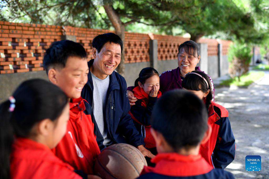 Song Zhongsheng (3rd L) and his wife Li Yuemei (1st R, rear) chat with their students at Datuo teaching site in Datuo Village, Pingshun County, Changzhi City of north China's Shanxi Province, Sept. 8, 2021. Nestled deeply in the Taihang Mountain at an elevation of 1,600 meters in Pingshun County, the Datuo teaching site is the only educational facility within 10 kilometers reach. Song Zhongsheng and his wife Li Yuemei, the only faculty at the site, have been working there for 16 years in a row, currently rendering their services to merely five students of varying ages. A perfect team of two, Song is responsible for classes of Chinese, political science, and physical education, as Li takes on mathematics, painting, and music. More often than not, they need to walk some of their students' home after a full day's work at site. "Education is a life changer. We are willing to devote our time here, serving as a bridge for these kids to walk out of the mountain." (Xinhua/Zhan Yan)