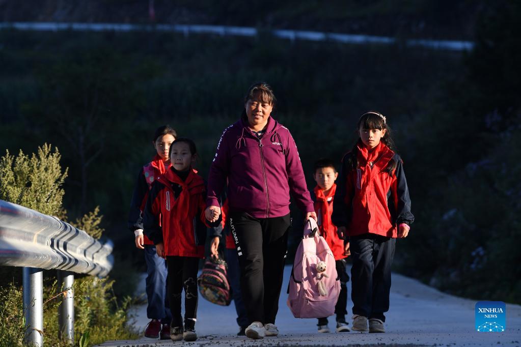 Li Yuemei (C) walks students home after school in Datuo Village, Pingshun County, Changzhi City of north China's Shanxi Province, Sept. 7, 2021. Nestled deeply in the Taihang Mountain at an elevation of 1,600 meters in Pingshun County, the Datuo teaching site is the only educational facility within 10 kilometers reach. Song Zhongsheng and his wife Li Yuemei, the only faculty at the site, have been working there for 16 years in a row, currently rendering their services to merely five students of varying ages. A perfect team of two, Song is responsible for classes of Chinese, political science, and physical education, as Li takes on mathematics, painting, and music. More often than not, they need to walk some of their students' home after a full day's work at site. "Education is a life changer. We are willing to devote our time here, serving as a bridge for these kids to walk out of the mountain." (Xinhua/Zhan Yan)