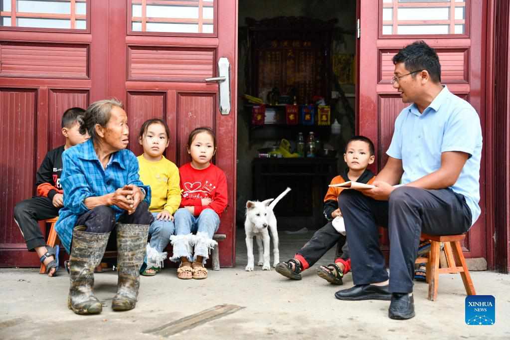 Pan Zhongyong (1st, R) visits a student's home in Songbai Village, Baojing Township of Zhenyuan County, southwest China's Guizhou Province, Sept. 7, 2021. Located deep in the mountainous area of Zhenyuan County, Qiandongnan Miao and Dong Autonomous Prefecture, southwest China's Guizhou Province, the Pingyu teaching point is supported mainly by a couple. In 2000, Pan Zhongyong graduated from a normal school and came to Pingyu teaching point as a teacher. Later, he met and married Zhu Muqun, a girl in the village. Over the years, the couple was responsible for teaching, safety management, cooking and so on. With the integration of local educational resources in recent years, the number of students in Pingyu teaching point has been decreasing. There are only 20 lower-grade students at the teaching point this semester. Nevertheless, the couple decides to stay as teachers to bring convenience for the children and their parents. (Xinhua/Yang Wenbin)