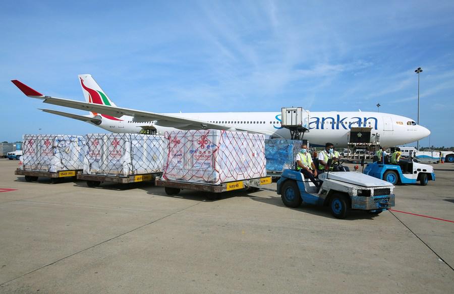 Staff members transport the COVID-19 vaccine donation from China at the Bandaranaike International Airport on the outskirts of Colombo, Sri Lanka, July 27, 2021. (Photo by Ajith Perera/Xinhua)