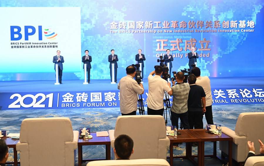 Photo taken on Sept. 7, 2021 shows the inauguration ceremony of the BRICS Partnership on New Industrial Revolution Innovation Center in Xiamen, east China's Fujian Province. (Xinhua/Lin Shanchuan)