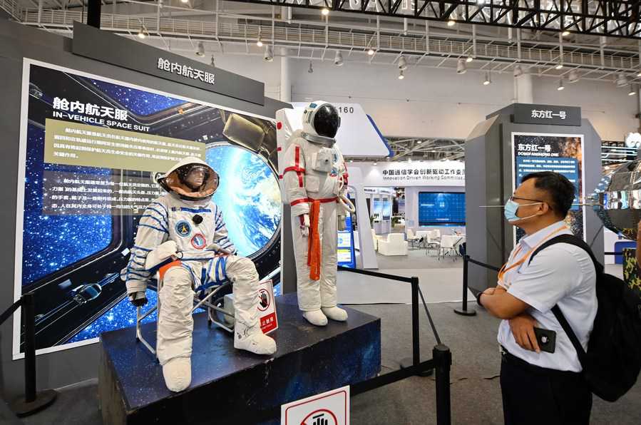 A visitor views In-Vehicle Space Suit during an exhibition on BRICS New Industrial Revolution held in Xiamen, east China's Fujian Province, Sept. 8, 2021. (Xinhua/Lin Shanchuan)