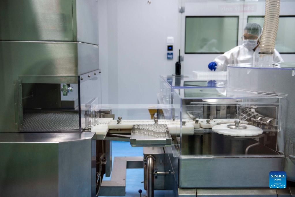 A technician operates during a test run of the "fill and finish" process for CanSino vaccine at Solution Biologics factory in Kuala Lumpur, Malaysia, Sept. 8, 2021. Chinese company CanSino Biologics has helped Malaysia cross another milestone in vaccine manufacturing, this time by transferring technology to enable the local "fill and finish" of the COVID-19 vaccine based on the adenovirus platform. Malaysian pharmaceutical company Solution Biologics deputy group managing director Mohd Nazlee Kamal told Xinhua that close and friendly cooperation with CanSino has made the venture possible. (Photo by Chong Voon Chung/Xinhua)