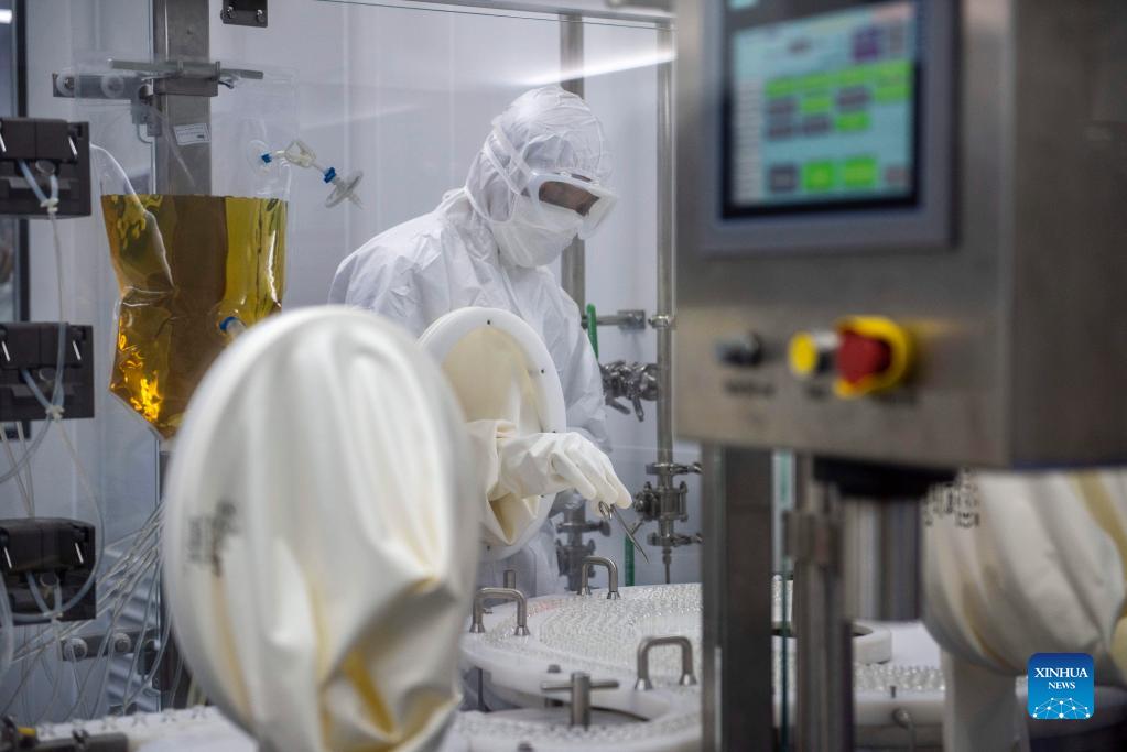 A technician operates during a test run of the "fill and finish" process for CanSino vaccine at Solution Biologics factory in Kuala Lumpur, Malaysia, Sept. 8, 2021. Chinese company CanSino Biologics has helped Malaysia cross another milestone in vaccine manufacturing, this time by transferring technology to enable the local "fill and finish" of the COVID-19 vaccine based on the adenovirus platform. Malaysian pharmaceutical company Solution Biologics deputy group managing director Mohd Nazlee Kamal told Xinhua that close and friendly cooperation with CanSino has made the venture possible. (Photo by Chong Voon Chung/Xinhua)
