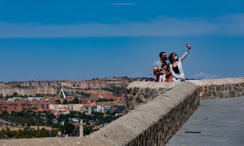 Tourists take selfie in the old city of Toledo, Spain, Sept. 22, 2020. Tourism in Toledo has been heavily affected by the COVID-19 pandemic. (Photo/Xinhua)