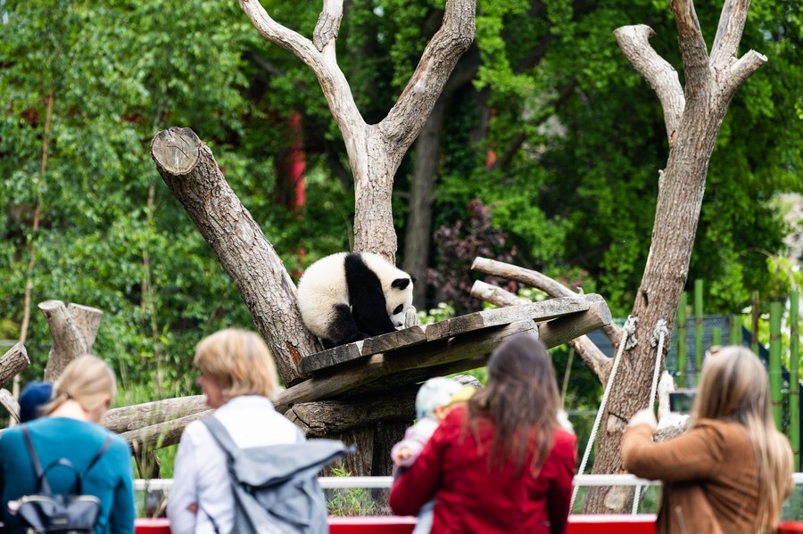Visitors look at a giant panda cub at Zoo Berlin in Berlin, capital of Germany, May 28, 2020. (Photo by Binh Truong/Xinhua)