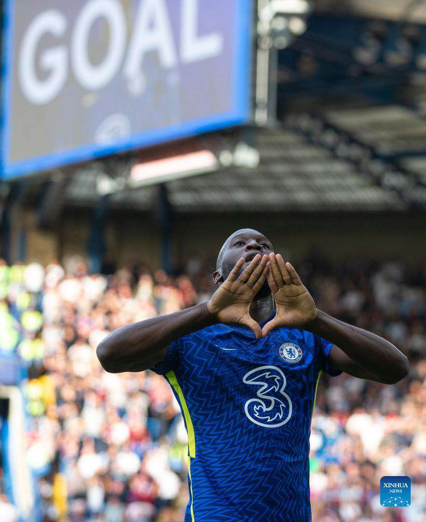 Chelsea's Romelu Lukaku celebrates after scoring during the Premier League match between Chelsea and Aston Villa in London, Britain, on Sept. 11, 2021. (Xinhua/Han Yan)