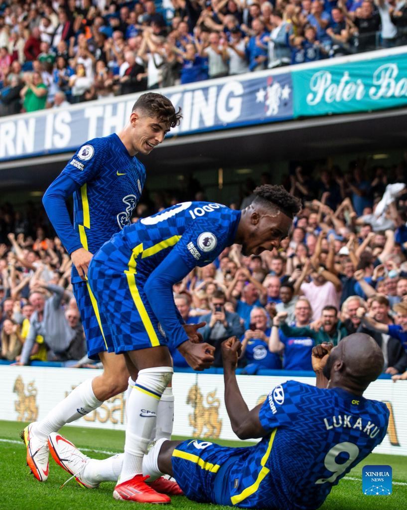 Chelsea's Romelu Lukaku (bottom) celebrates after scoring during the Premier League match between Chelsea and Aston Villa in London, Britain, on Sept. 11, 2021. (Xinhua/Han Yan)